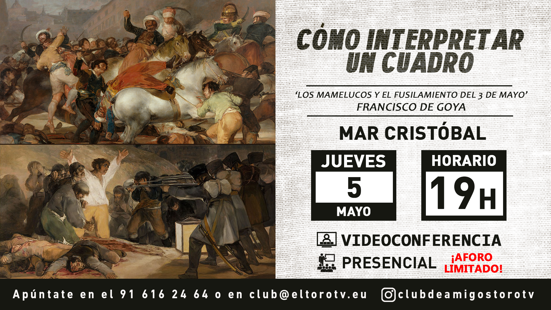 Vuelve Mar Cristóbal con su precioso y didáctico ciclo dedicado a la interpretación de una cuadro. Y las pinturas elegidas para esta ocasión no son fruto de la casualidad: en estas fechas se conmemora que el 2 de Mayo de 1808 el pueblo madrileño se levantó en armas para rebelarse contra la ocupación francesa de España y para expulsar a su ejército, dando inicio a la llamada Guerra de la Independencia Española. Y la mirada crítica e implacable de Francisco de Goya lo inmortalizó de manera magistral en dos cuadros: El dos de mayo de 1808 en Madrid, también llamado La carga de los mamelucos y Los fusilamientos del 3 de Mayo. Dos pinturas contrapuestas y complementarias realizadas, como él mismo afirma, para “perpetuar por medio del pincel, las más notables y heroicas acciones o escenas de nuestra gloriosa insurrección contra el tirano de Europa”.